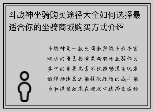 斗战神坐骑购买途径大全如何选择最适合你的坐骑商城购买方式介绍